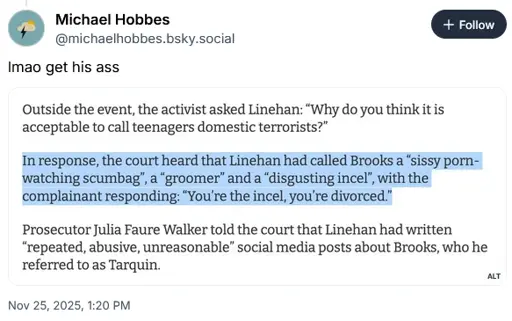 Source: https://bsky.app/profile/michaelhobbes.bsky.social/post/3m6hgmqphr224 Article: https://www.thenational.scot/news/25648462.anti-trans-activist-graham-linehan-guilty-criminal-damage