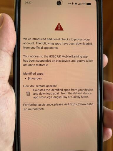 HSBC has chosen to block its mobile app on my phone because *checks notes* I've got a password manager, Bitwarden, installed via F-Droid.