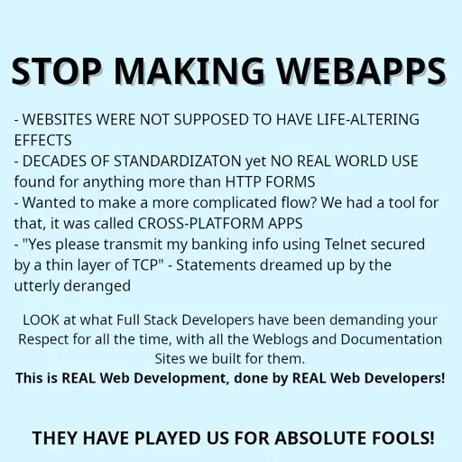 somerandomperson@lemmy.dbzer0.com to Programmer Humor@lemmy.ml · 2 months agoelectron.jxllemmy.mlimagemessage-square10linkfedilinkarrow-up1137arrow-down116