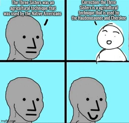 What the hell are you talking about? The statement “Native Americans used the Three Sisters in the past” is a 100% correct statement. Just because it isn’t as precise as you want it to be doesn’t mean it’s not accurate