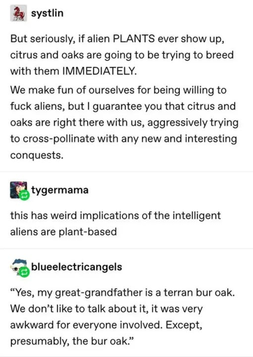 Some plant aliens land and discover the air itself gets them pregnant from all the pollen freely flying around from such numerous and primitive plant life. Terra is the plant equivalent of an unbridled sex planet.
