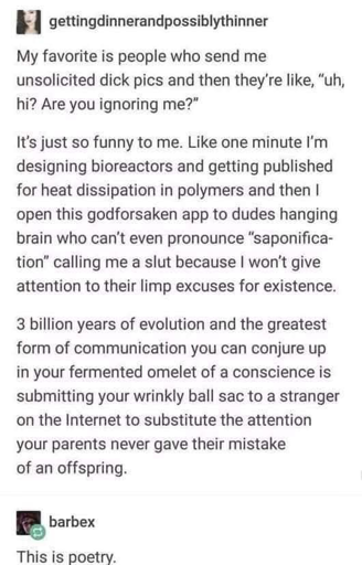 That said, the unsolicited dick pics I’ve received have been more of a frustration because I stopped responding. In that scenario they want a reaction, any reaction.