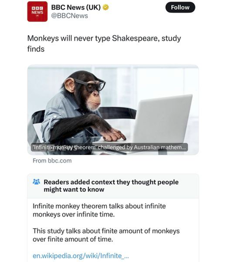 And the study was even proven wrong in the 17th century. A finite amount of monkeys already produced Shakespeare in a finite amount of time; it took roughly 55 million years.