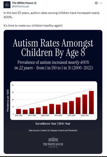- Yeah, after deleting any data the CDC used to have that they didn’t agree with. And making up any new data they need to make their preconceived notion as perceivably supported as possible. - In this case no. It’s the fact that we’re better at diagnosing things, any disease that doesn’t have active treatments is going to be similar. - You could do reports of ED over time and that graph is going to skyrocket not because it’s more or less common but rather more people are willing to get diagnosed to seek remediation. Right around the discovery of Viagra and it’s ilk you’d see skyrocketing ED diagnoses and it’s not like dicks just suddenly stopped working. - Also, more kids are just getting diagnosed. Back when I was in school in the 90s, I was very lucky to be in a rich school district that actually taught teachers how to spot signs so they could recommend a screening, which the district would foot the bill for because they had a psychologist on staff. Now, more and more districts have people like that, and more and more teachers are taught how to spot early signs of autism (and more parents are aware of it) that kids who previously might have just been “weird kids” are actually getting diagnosed with autism. - I won’t deny a potential environmental link, but if there is one, it’s likely more linked to fossil fuels than anything. BUT that’s hard to get traction against, and it doesn’t have a magic bullet that’ll immediately “solve” the issue.