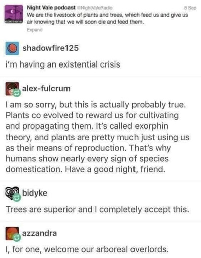 My point is, people talk about this as if it’s the plants having a nice chat and a cup of tea and talking about politics. It isn’t - it’s more like a dog being able to smell some dog piss and understand something about the dog that pissed there.