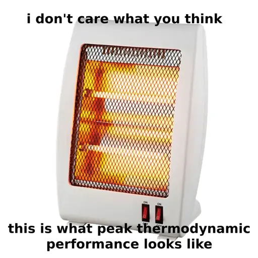 - Refrigeration cycle scoffs at your mere 100% efficiency - Nah this thing puts out light and probably vibrates as well, so not even 100%. - Well ultimately it all becomes heat. Maybe a tiny amount escapes a window or something. So we could say 99%. - But heat pumps still reign supreme, at least until it gets super cold. - In the end we are all infinitely falling into the pit of entropy - Speak for yourself.