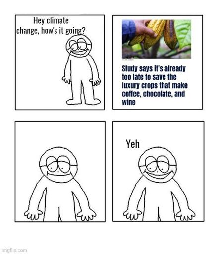 Oh it wasnt my intention to make it sound like climate change doesnt negatively impact anything, but “these things get more expensive” is a very different thing than “these crops are going extinct and theres nothing that can be done about it” the way that headline seems to imply.