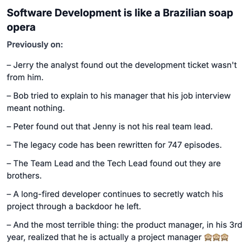 arrow-up174arrow-down1imageSoftware Development is like a Brazilian soap operalemmy.ml☆ Yσɠƚԋσʂ ☆@lemmy.ml to Programmer Humor@lemmy.mlEnglish · 2 months agomessage-square4linkfedilink