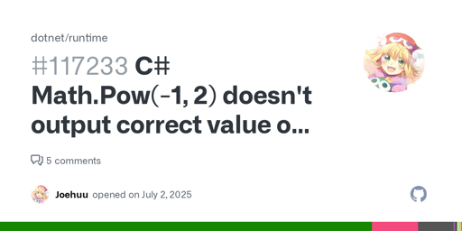 arrow-up13arrow-down1external-linkMath.Pow(-1, 2) == -1 in Windows 11 Insider buildgithub.comRSS Bot@lemmy.bestiver.seMB to Hacker News@lemmy.bestiver.seEnglish · 6 months agomessage-square1linkfedilinkfile-text